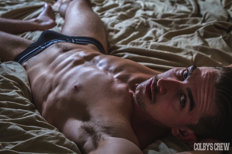 While Dominic and Matt seem to be eyeing each other, Colby has his sights set on Jack. As he gets up and heads toward his bedroom, Colby eyes Jack to follow him. Jack doesn’t miss a beat! Once in the bedroom, the guys waste no time and start messing around. As they kiss, they start pealing each other’s clothes off. Colby pushes Jack onto the bed and heads right down for his buddy’s cock. He deep throats Jack’s 8 inch cut cock, licks and sucks the stud’s balls and head as he’s totally consumed by his artful handy work. Then Colby peels off his jeans, exposing his bouncing hard cock and moves right into Jack’s face. Jack meets Colby head on, so to speak, and sucks him deep. Jack’s blow job technique is awesome, but he is poised to do what few men do these days – Fuck the hell out of Colby. Our hairy hunk is begging for it. So Jack delivers. He willingly mounts Colby from behind and pounds the hefty butt kneeling in front of him, slapping Colby’s ass cheeks for good measure. He quickens the pace as Colby begs for more.